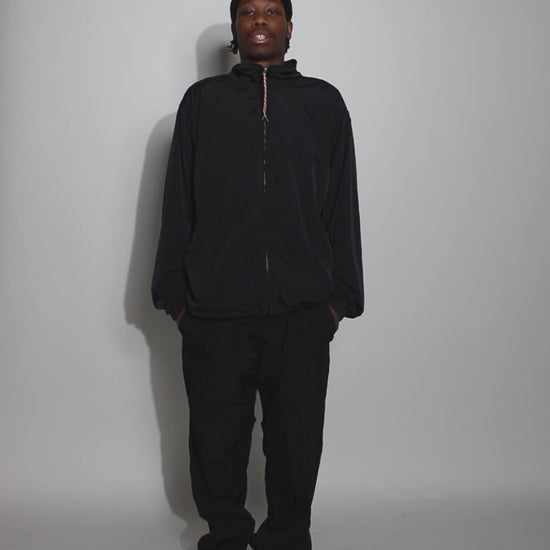 Unisex lightweight nylon zip-through windbreaker jacket made from a water-resistant black nylon. With a high collar, adjustable elastic drawstring hem and zip back pocket. With a screen-printed Aries MIIT logo on the back and a silicone brand patch on the sleeve. 100% PA. Made in Italy.
