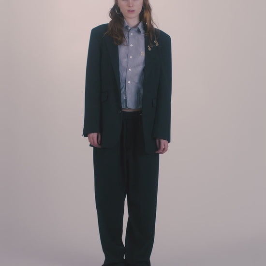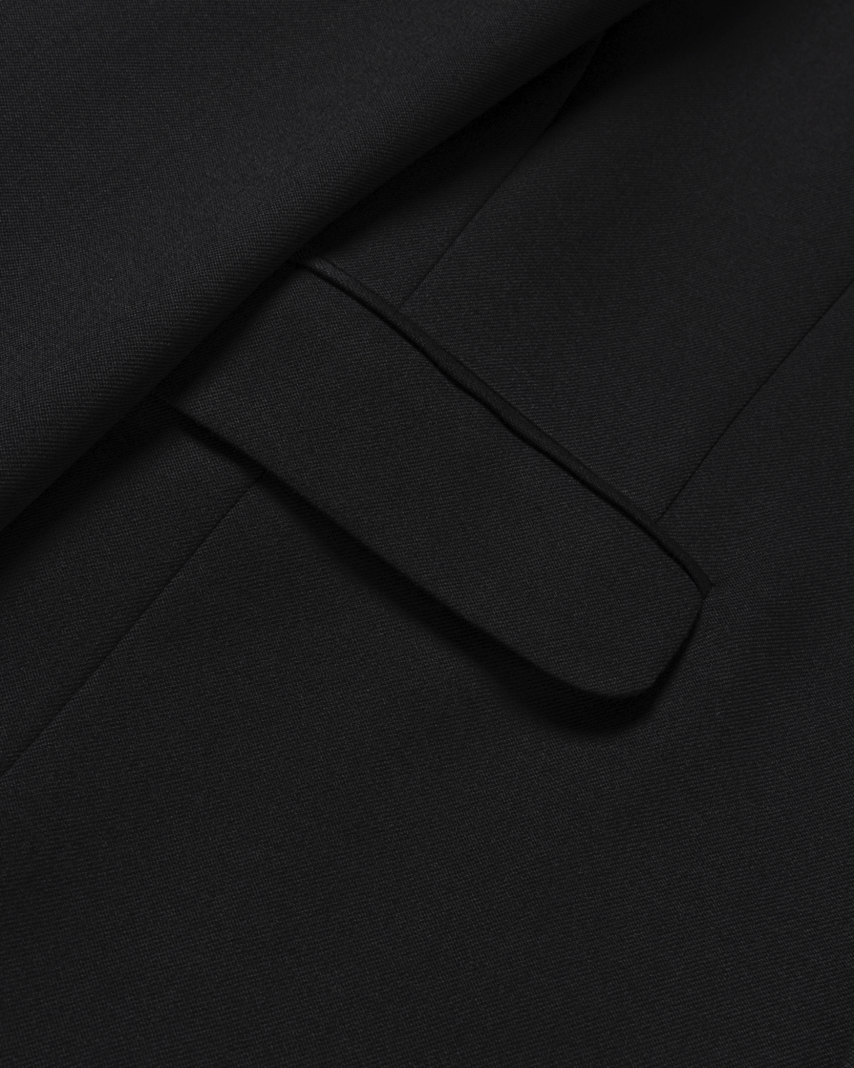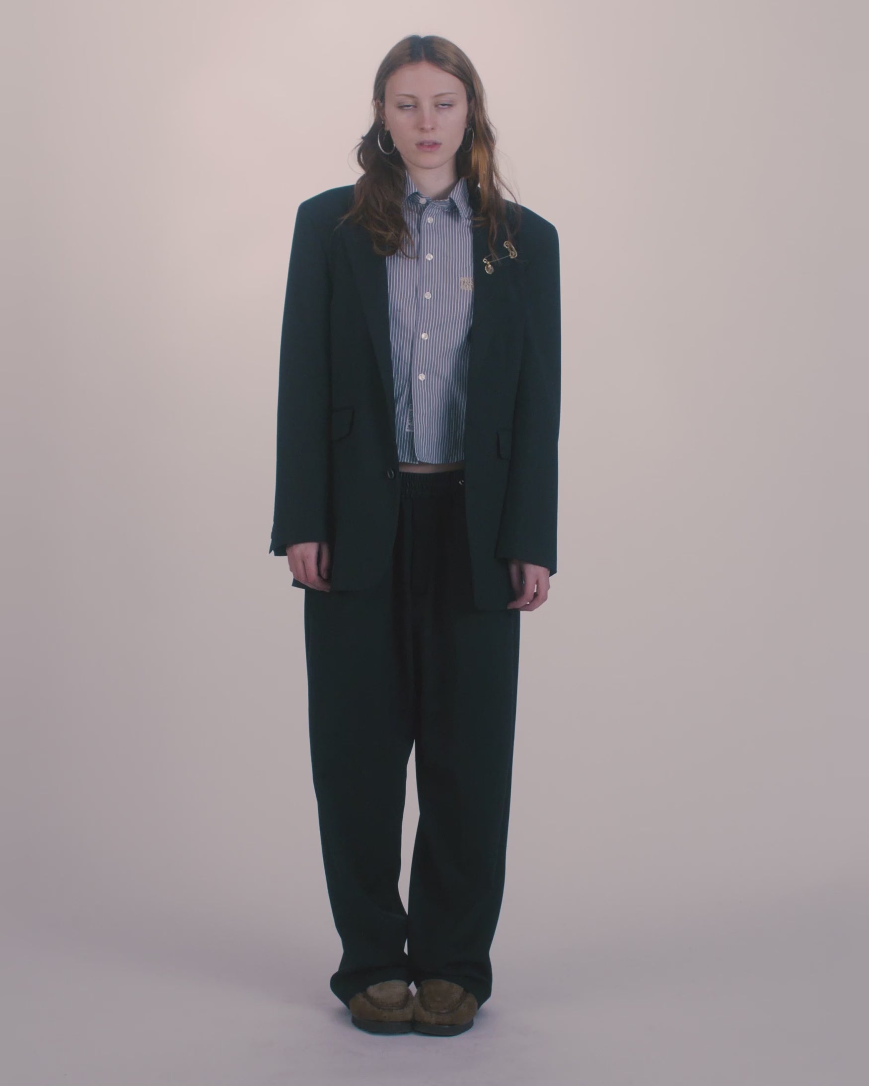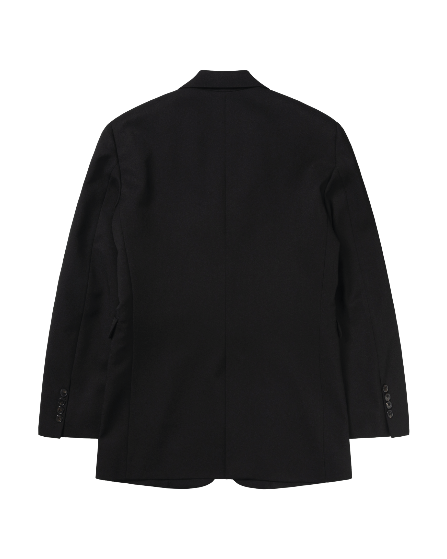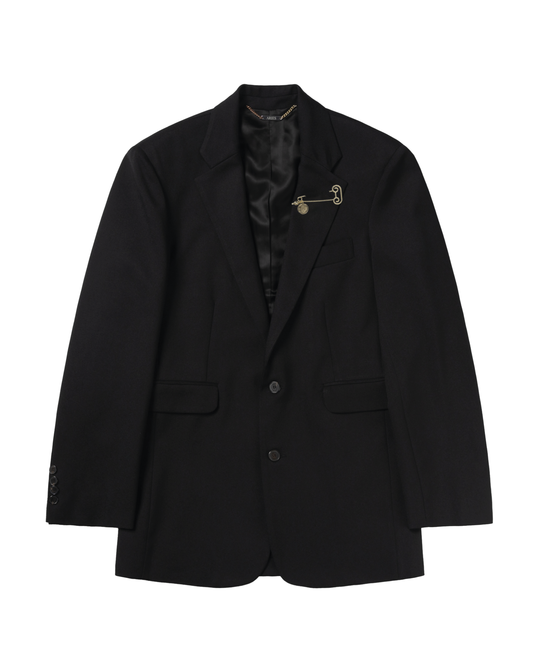 wool-blend single breasted tailored jacket with column safety pin hardware on lapel.
