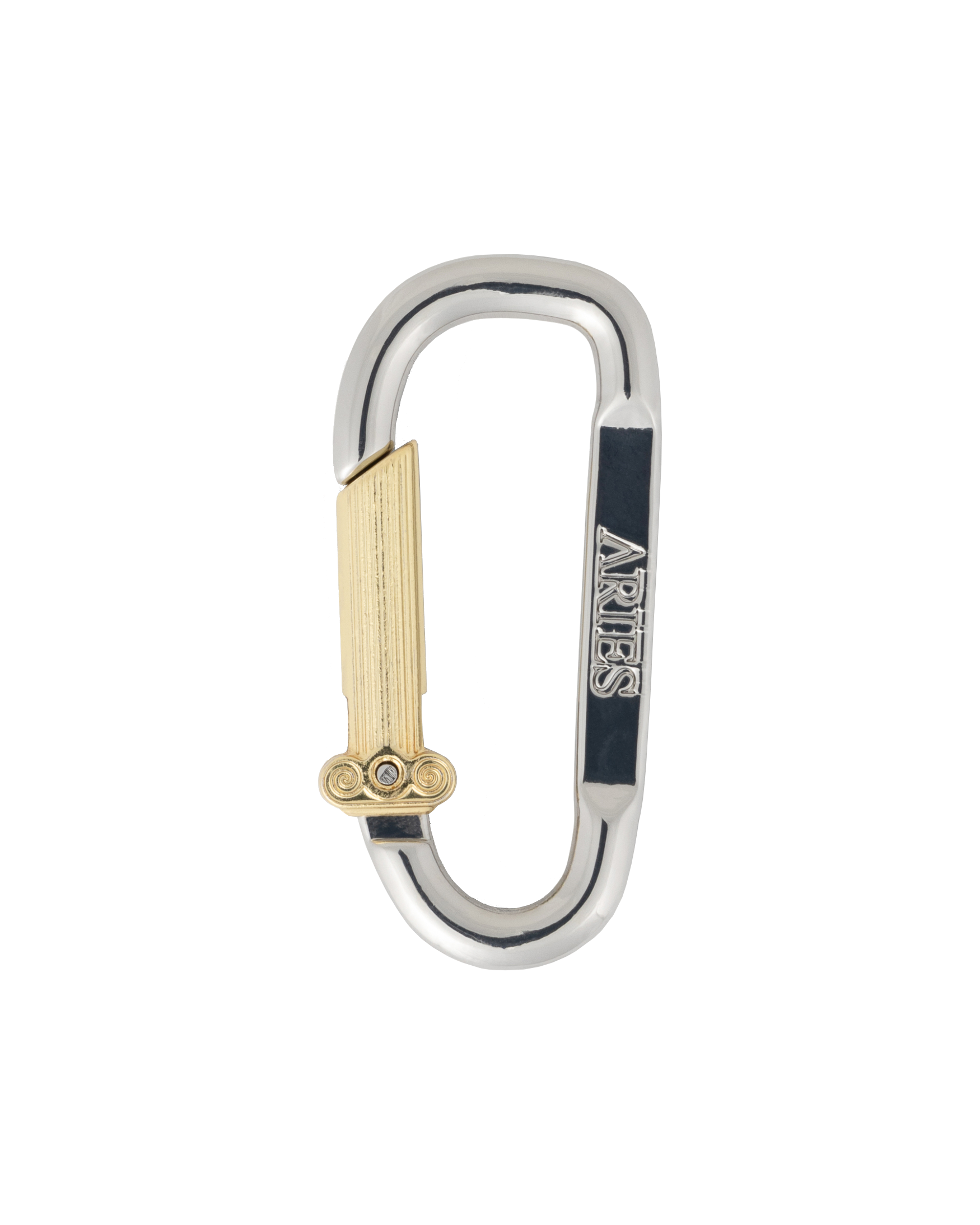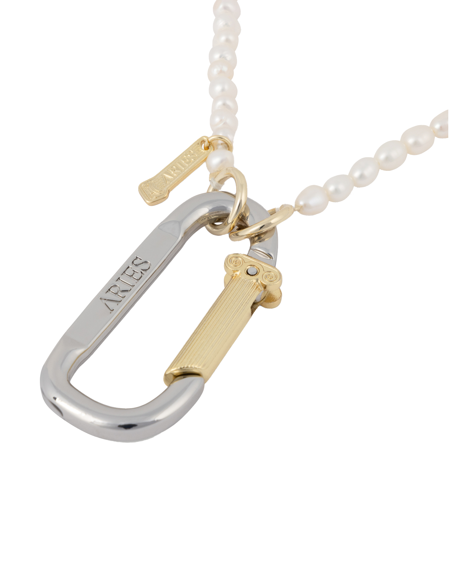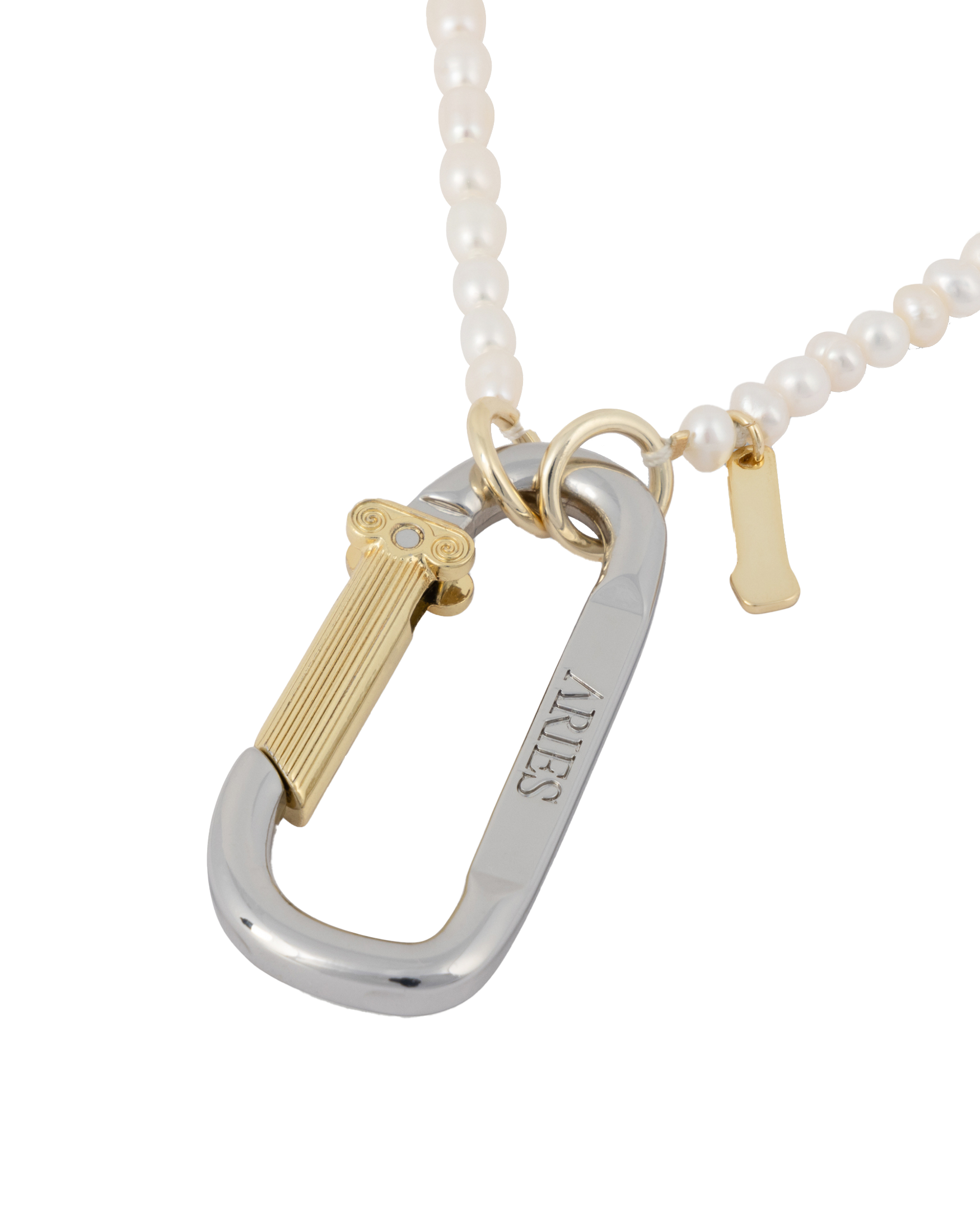 Mini carabiner pearl necklace. Brass - 10% Zinc - 25% Fresh Water Pearl - 55% Nylon - 10%