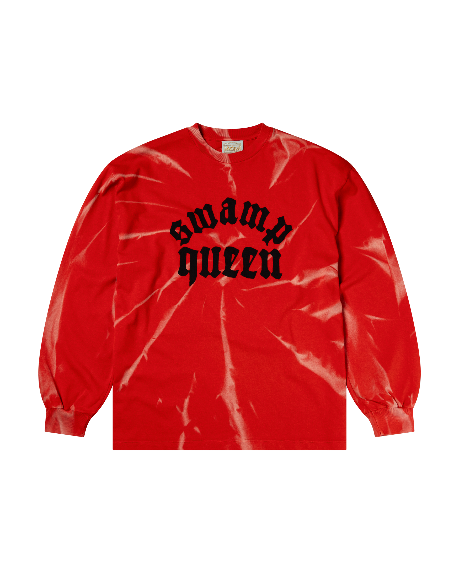 Unisex heavy-weight long sleeve t-shirt with seasonal 'Swamp Queen' graphic screen-printed on the front. Dyed with a rag-dye treatment.