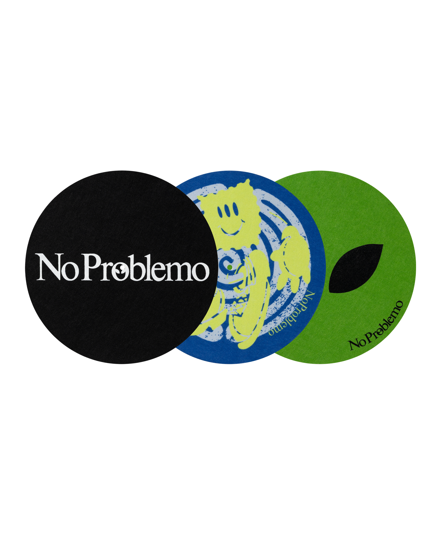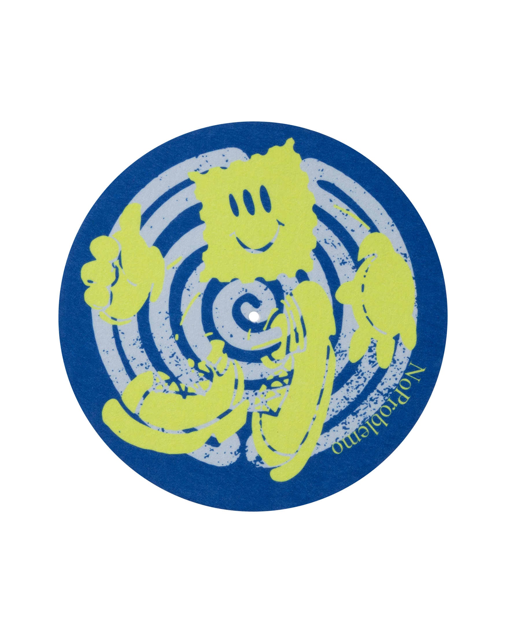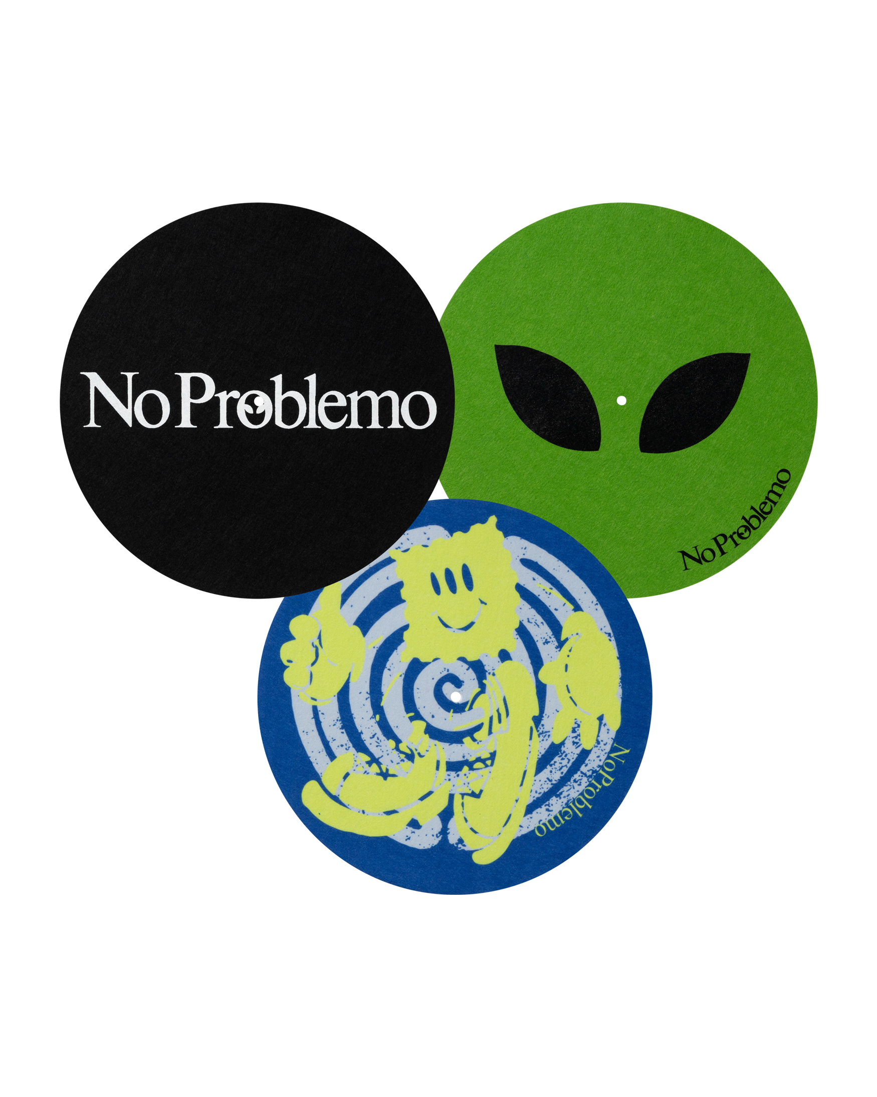 polyester turntable slipmats featuring classic no problemo, alien-o eyes and acid team graphics