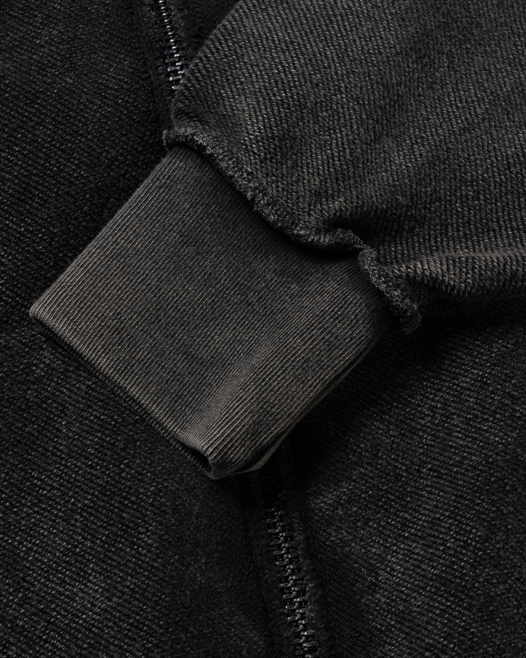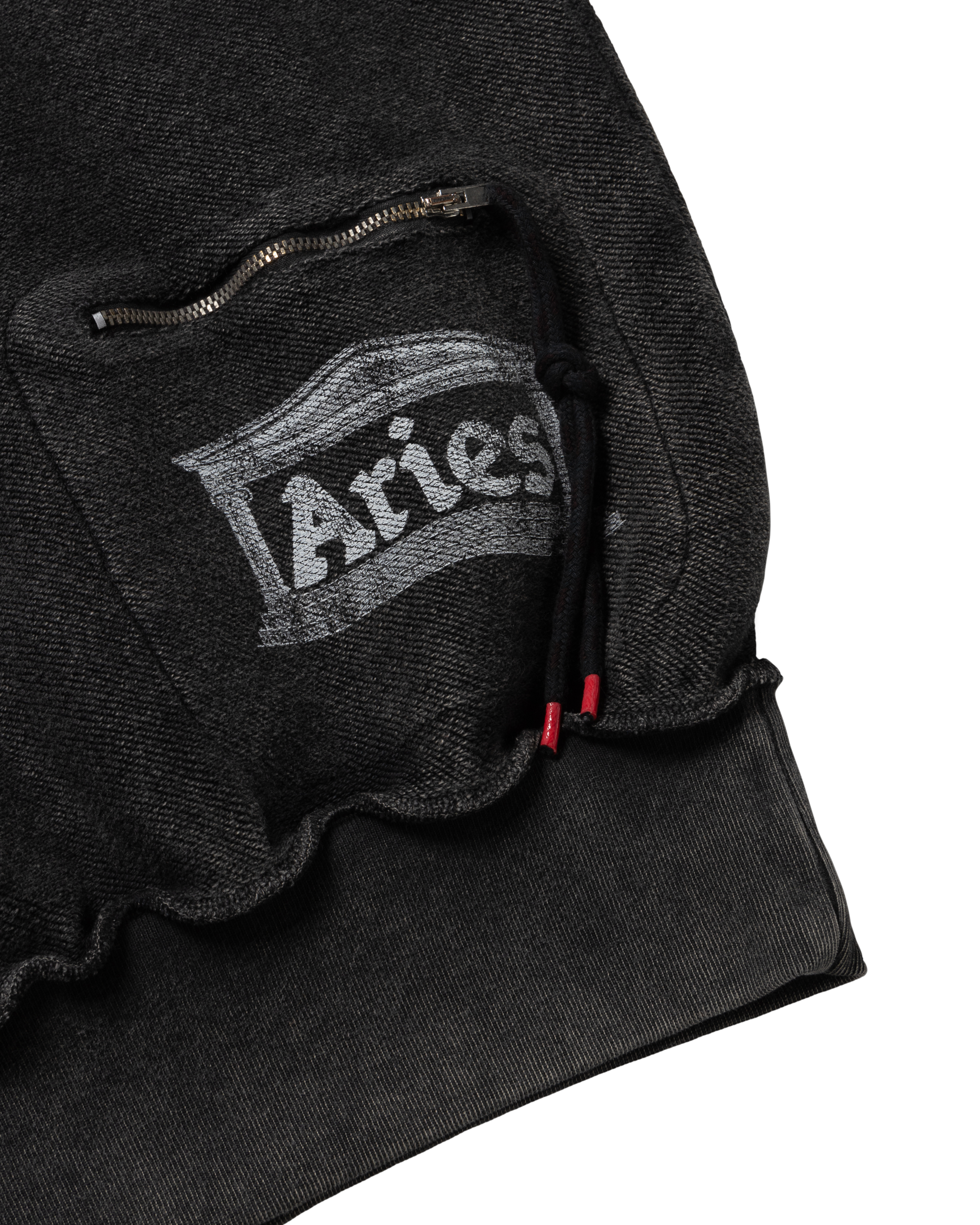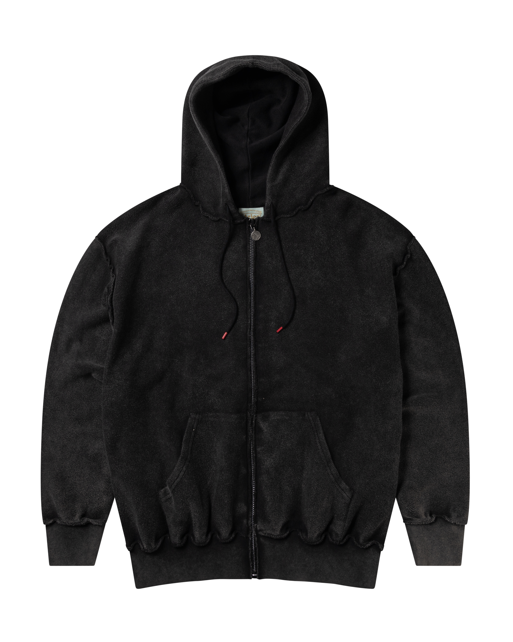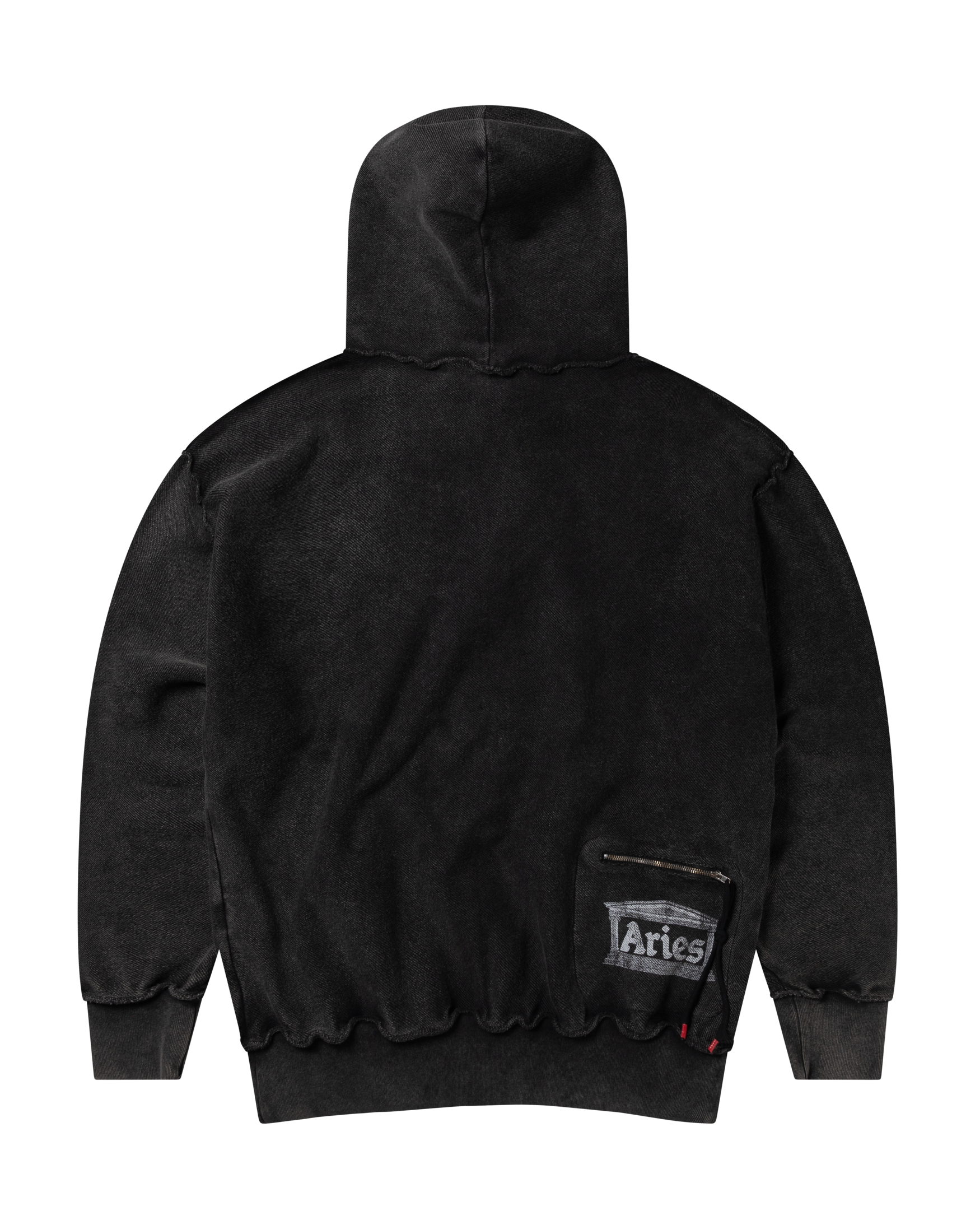 Zip-through hooded sweatshirt made in reverse side loop back jersey, featuring a 2-way Roman Coin zip and 'Aries Ancient Temple' screen print on the back zip pocket, finished with a heavy wash treatment for an aged look.