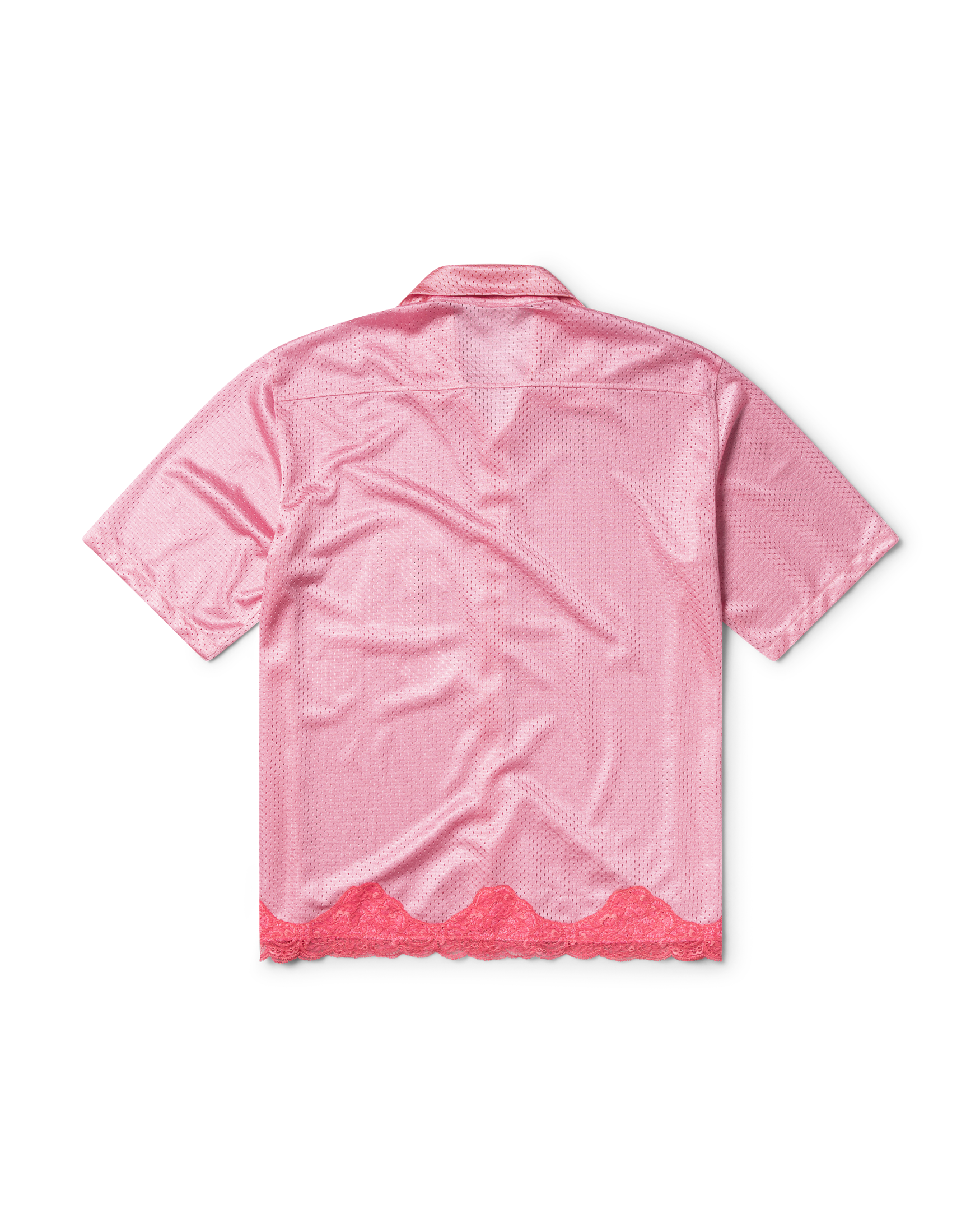 Unisex short-sleeved Hawaiian shirt in double layer shiny airtex fabric with a contrast lace trim at the hem. Featuring Aries Gothic A print on the wearer's left side.