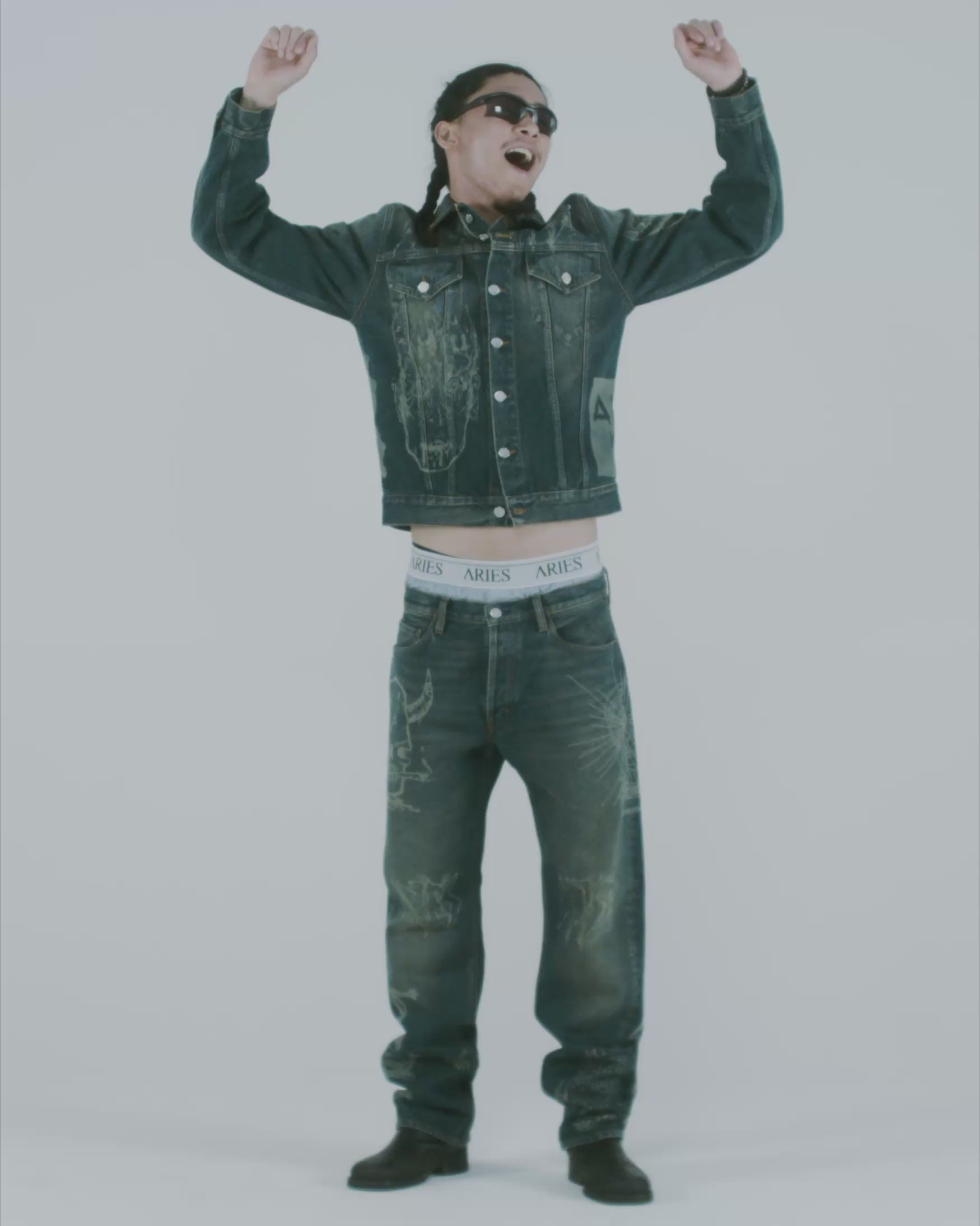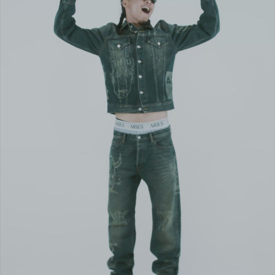 Unisex, five pocket Lilly jean made from 100% cotton denim with all over Aries Metal lasered graphics and a 00's vintage wash.