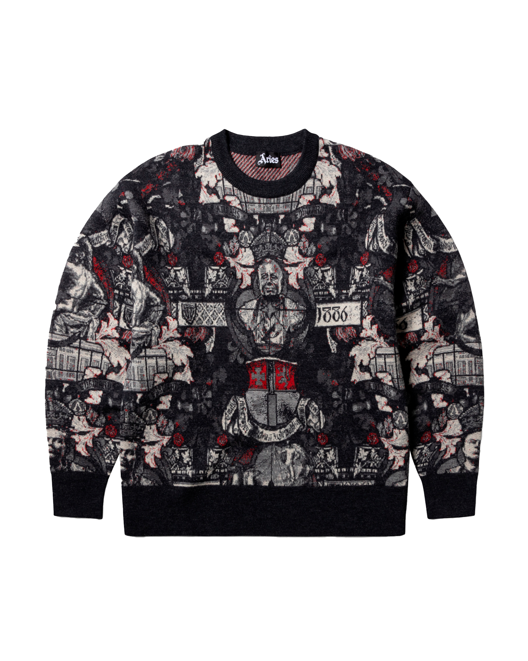 Wool mix, crew neck jumper jacquard knitted featuring Arsenal x Aries Renaissance style stained-glass artwork.
