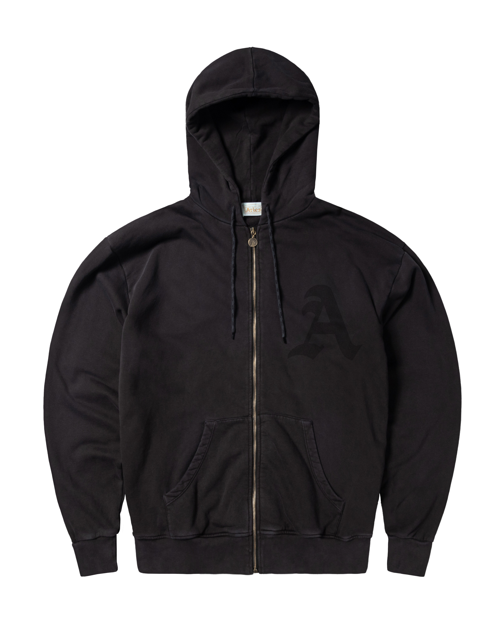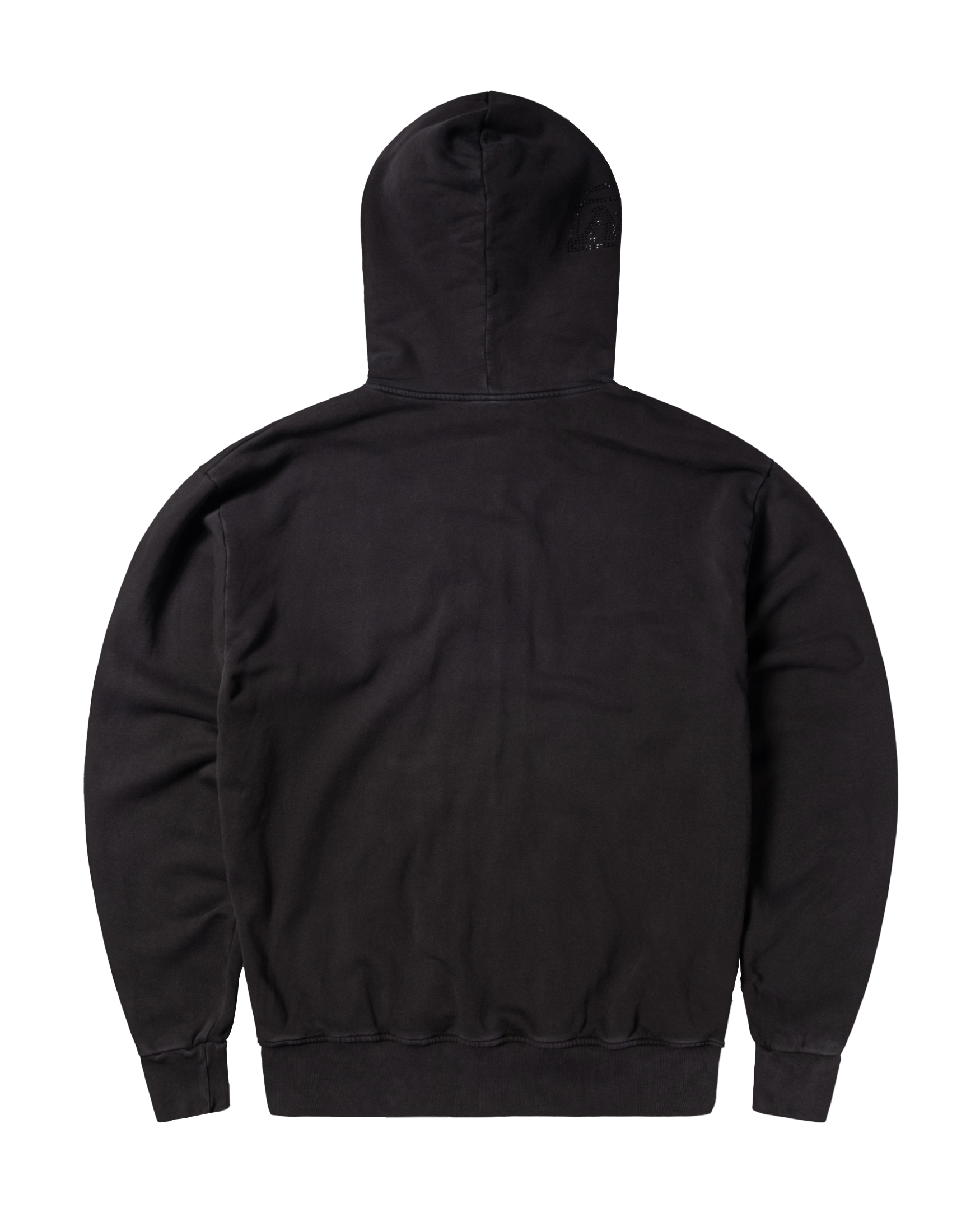 Unisex zip through hooded sweatshirt made in brushed-back cotton jersey fleece. Featuring Roman Coin zip puller and new Aries Gothic A screen print on the chest and a diamante temple on the hood. Finished with a heavy wash treatment for an aged look.