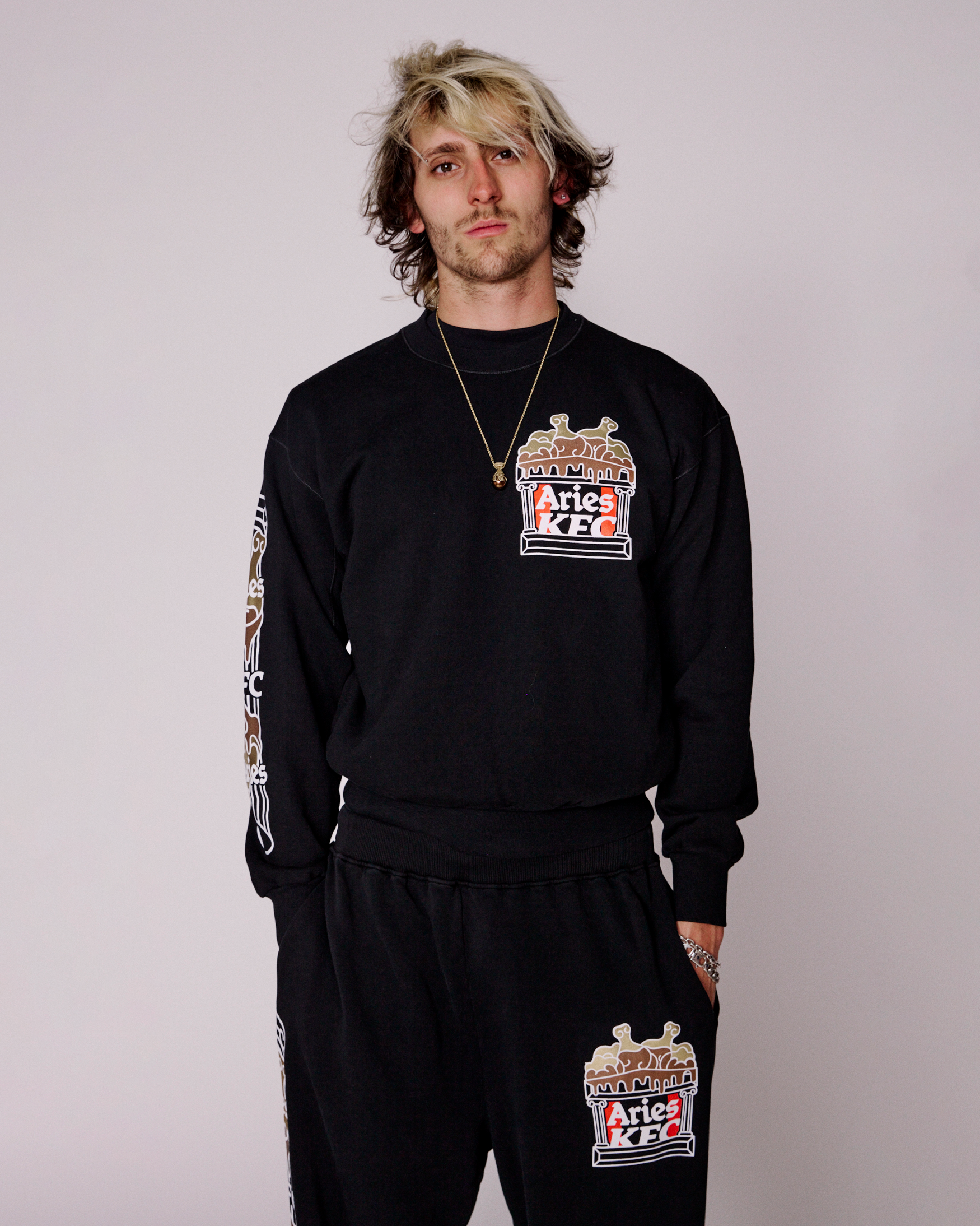 ARIES partners with KFC to present a ten-piece limited-edition collection that blends classical art references with streetwear silhouettes in a bold tribute to KFC’s iconic gravy. The capsule includes digitally printed denim, gold-detailed tees and sweats, and a standout distressed leather jacket featuring Renaissance-inspired artwork. Designed with irony and craftsmanship in equal measure, each piece reflects a shared celebration of indulgence, ritual, and irreverence.
