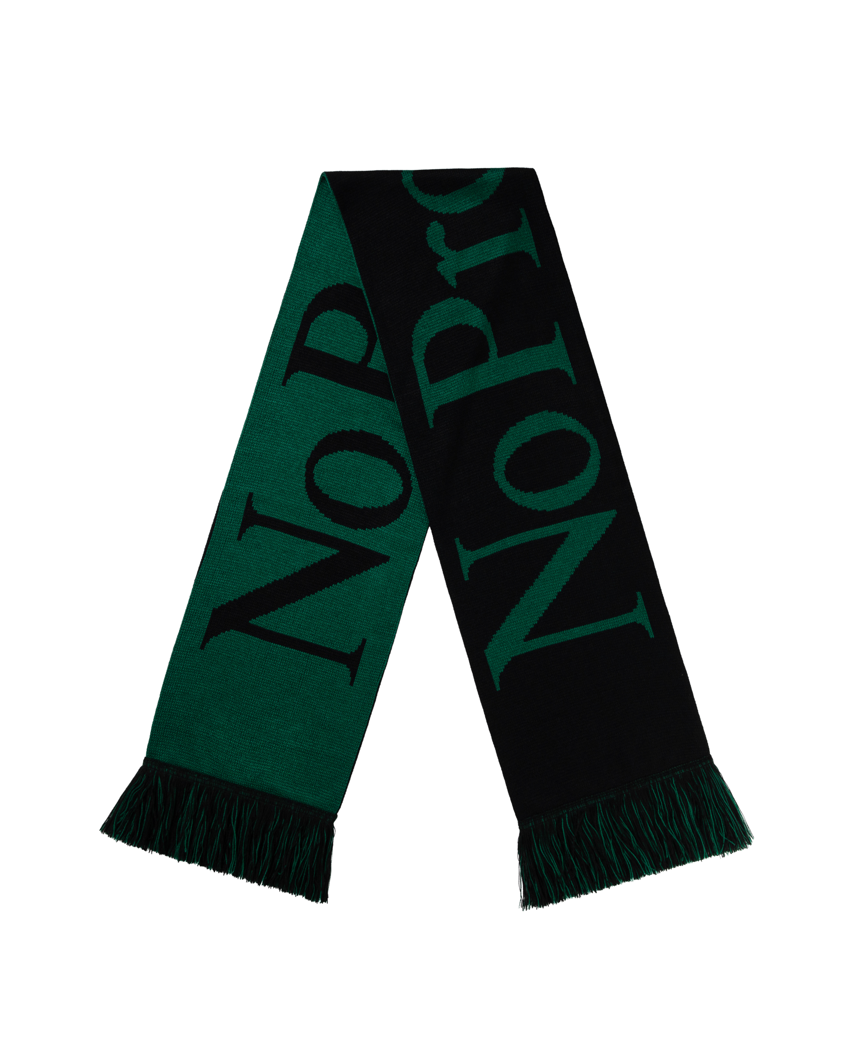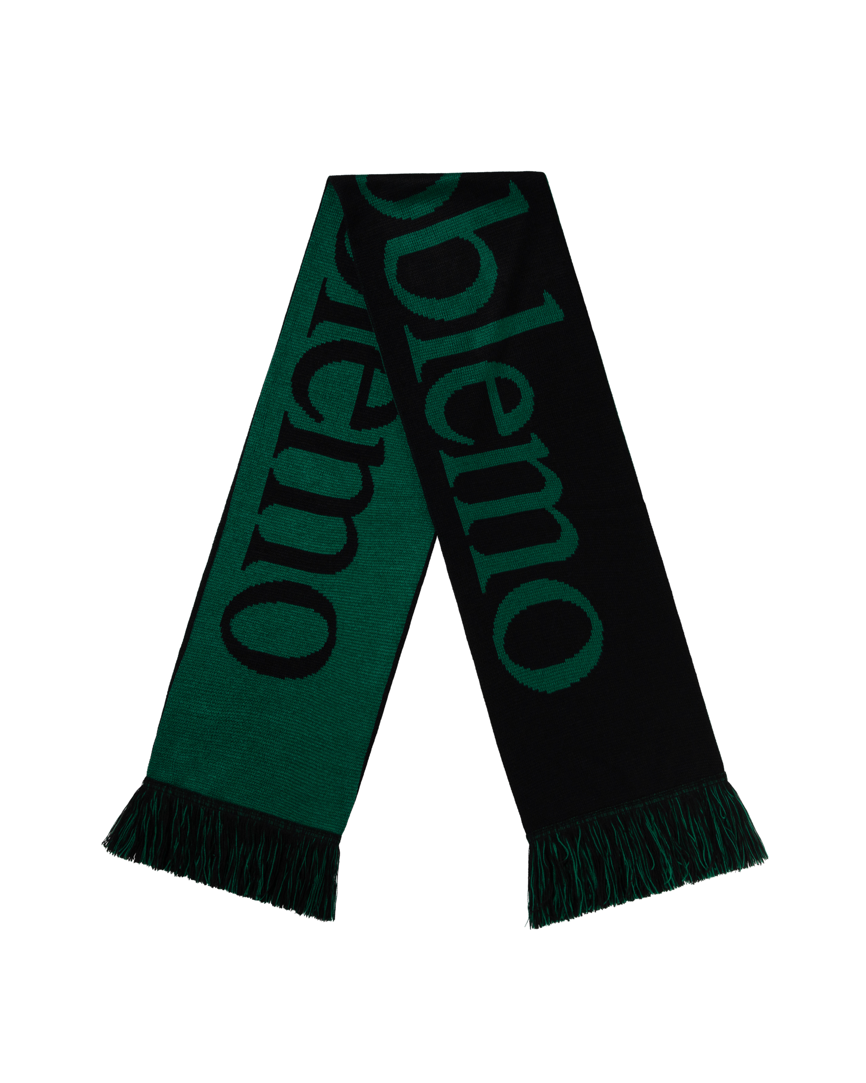 knitted acrylic football-style scarf with a no problemo intarsia design and fringed ends.
