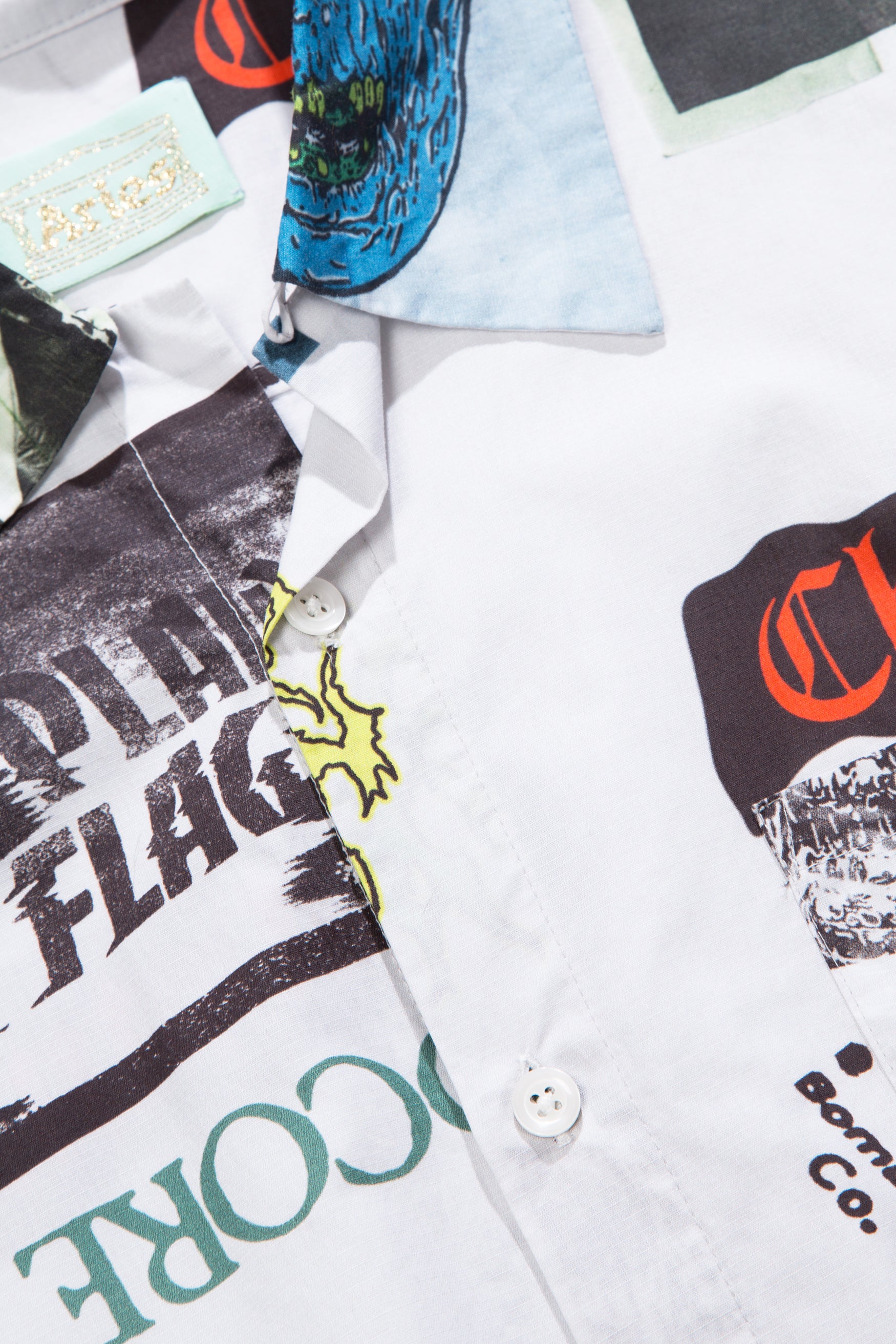 Cotton poplin shirt with camp collar and short sleeves. Features allover Thrasher print with vintage Purcell and French graphics.
