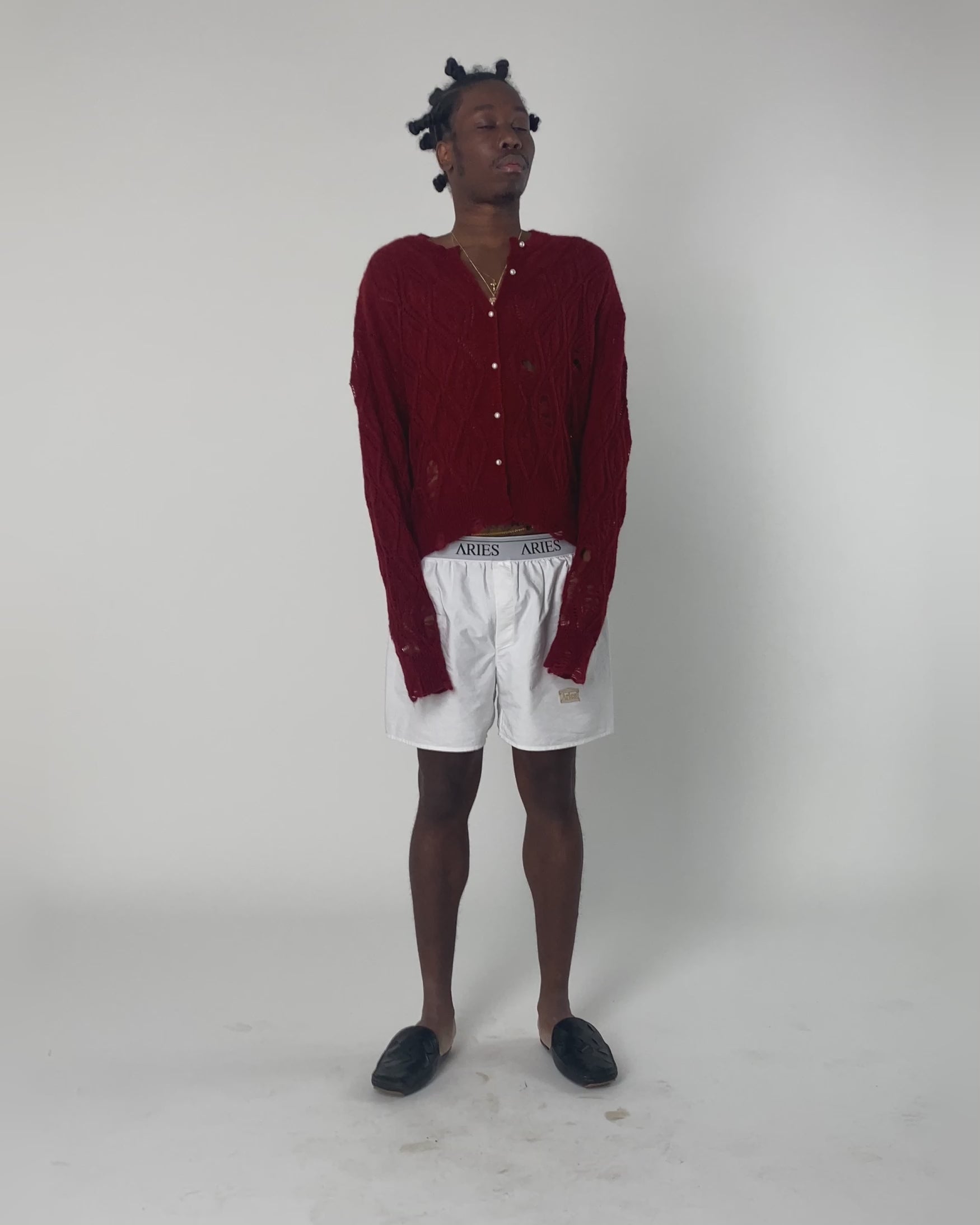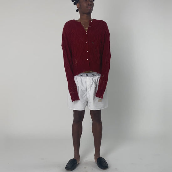 Unisex crew-neck cardigan knitted from a mohair-blend yarn. With a knitted lace leaf and laddered cable design. With a cropped fit and pearl buttons.