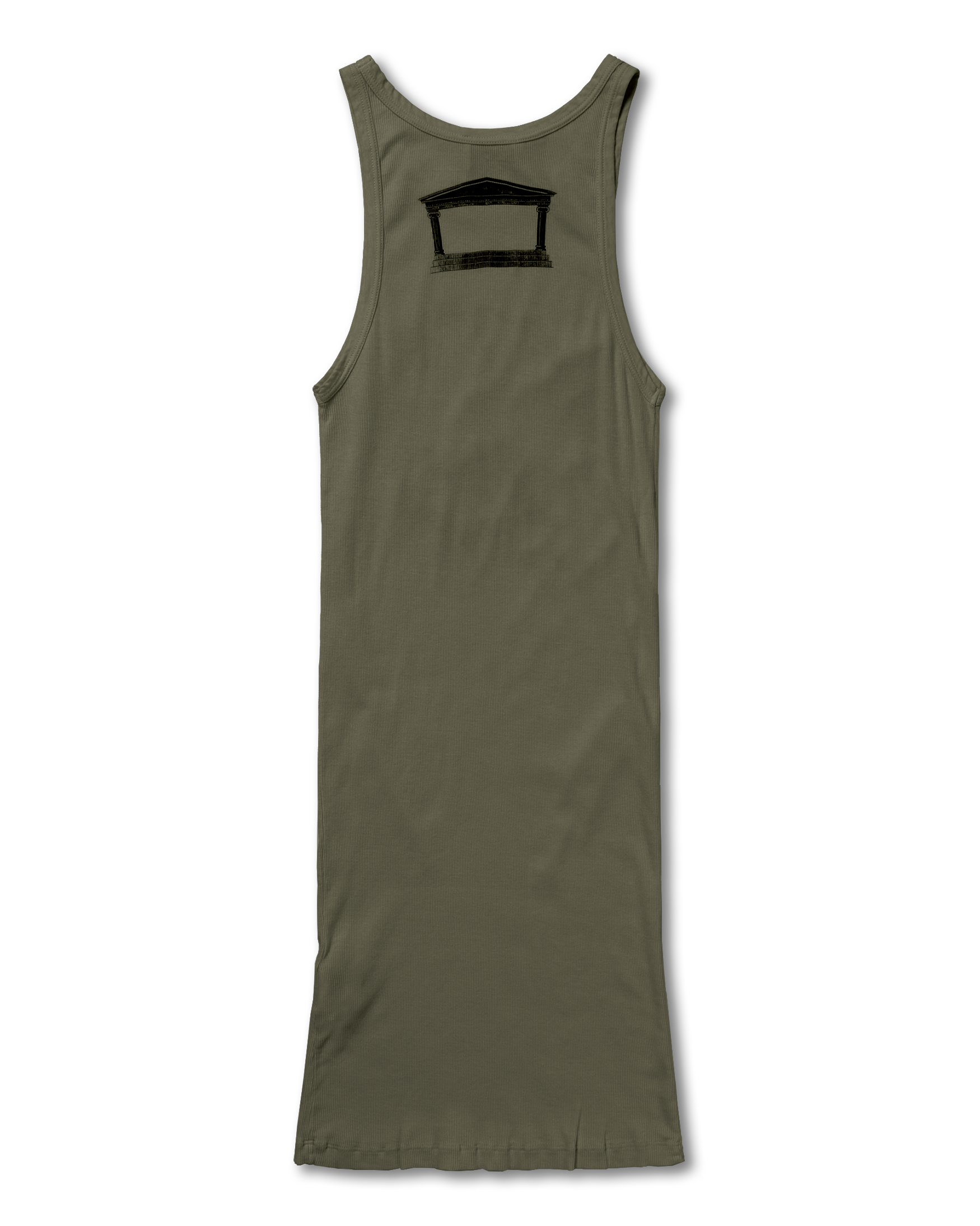 Lightweight 100% cotton rib jersey vest with a bound collar and armholes with seasonal Barbed Peace screenprint on the front and Classic Temple on the back.
