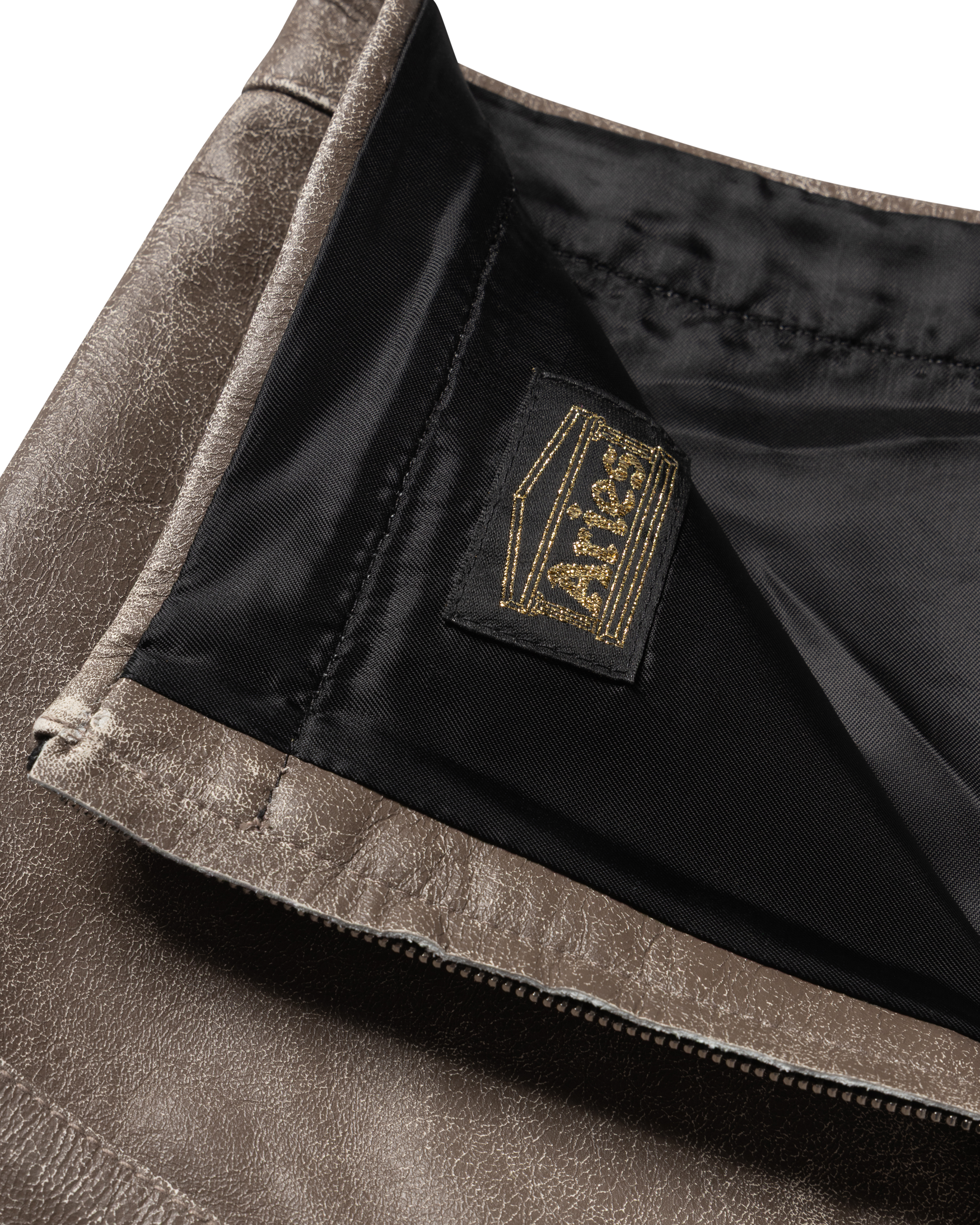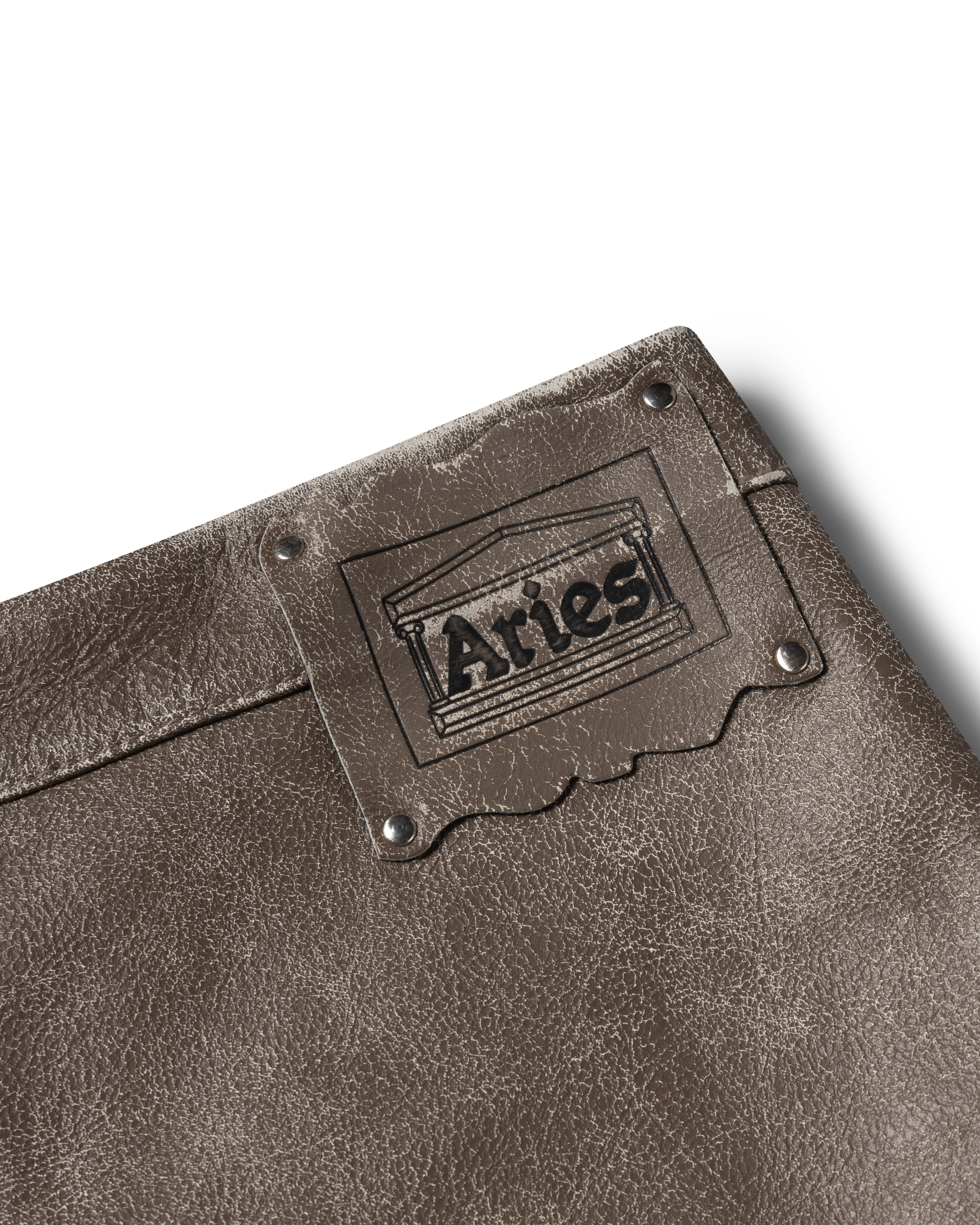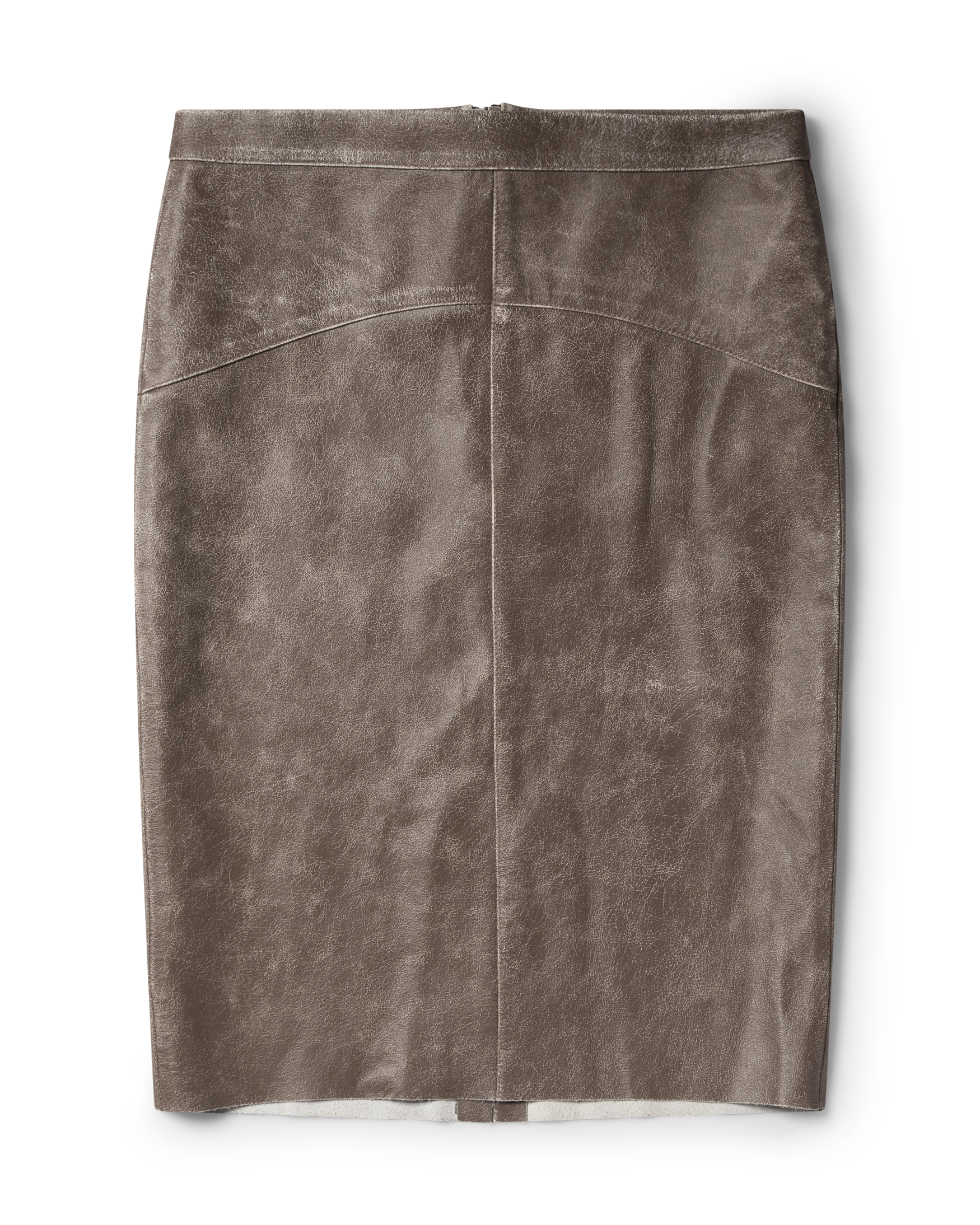 Mid-length pencil skirt in a distressed leather with panel detailing and an exposed centre back, zip-lined in black polyester. Featuring an embossed Aries Temple leather patch.