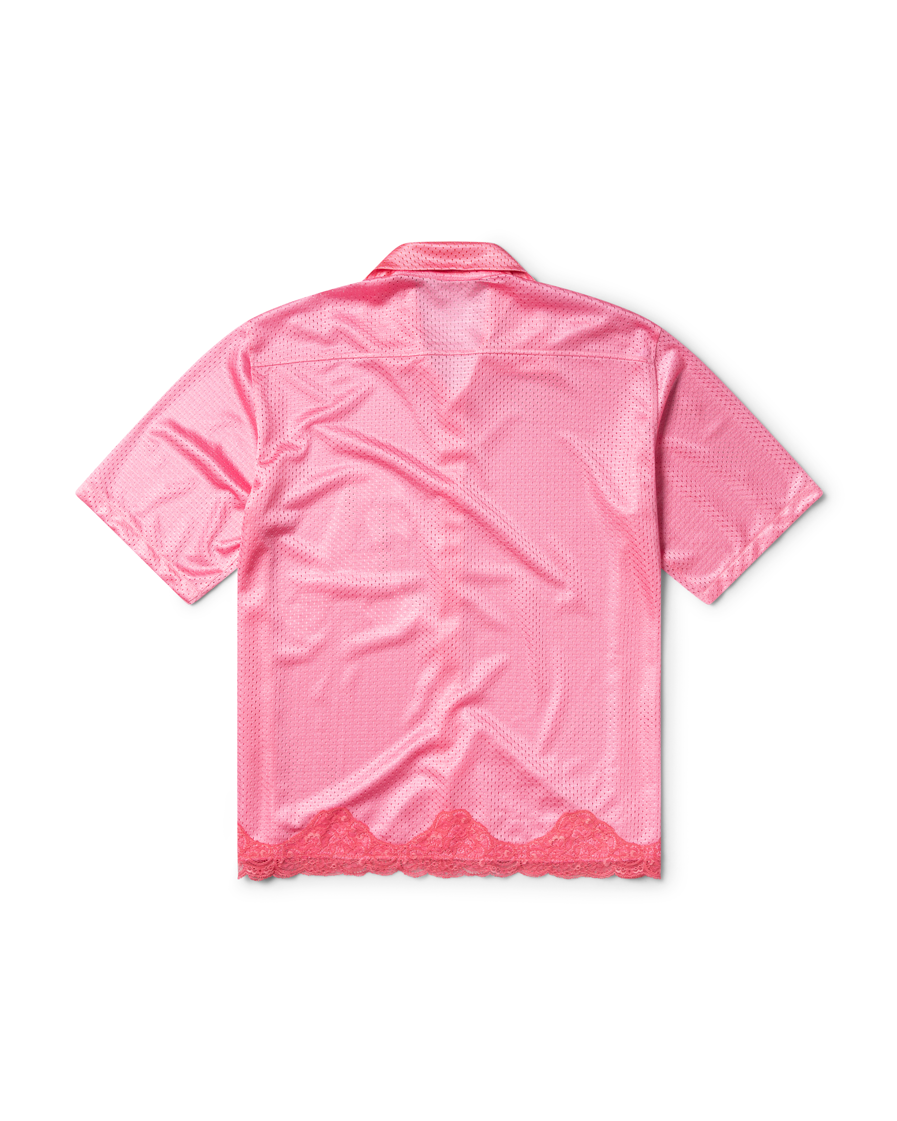 Unisex short-sleeved Hawaiian shirt in double layer shiny airtex fabric with a contrast lace trim at the hem. Featuring Aries Gothic A print on the wearer's left side.