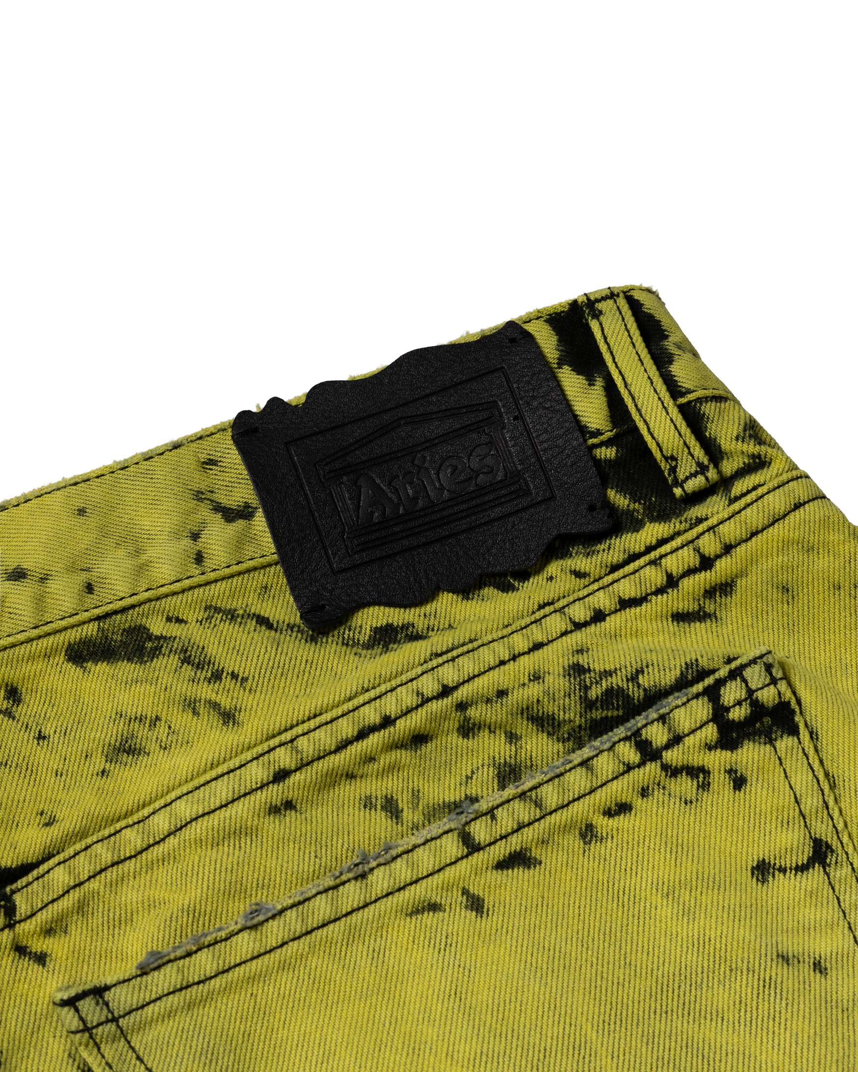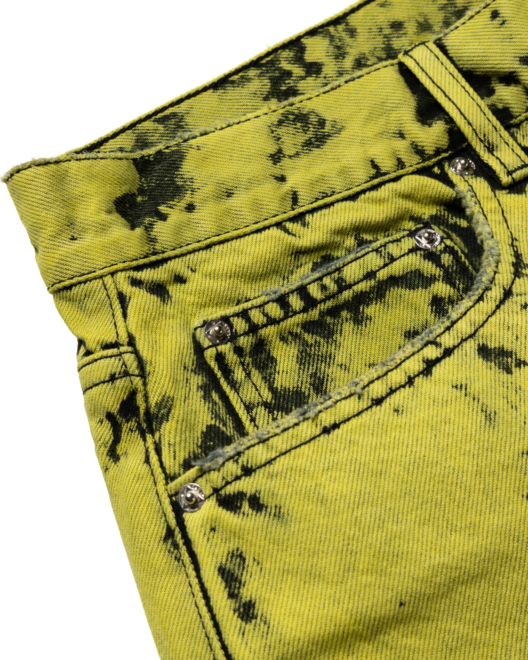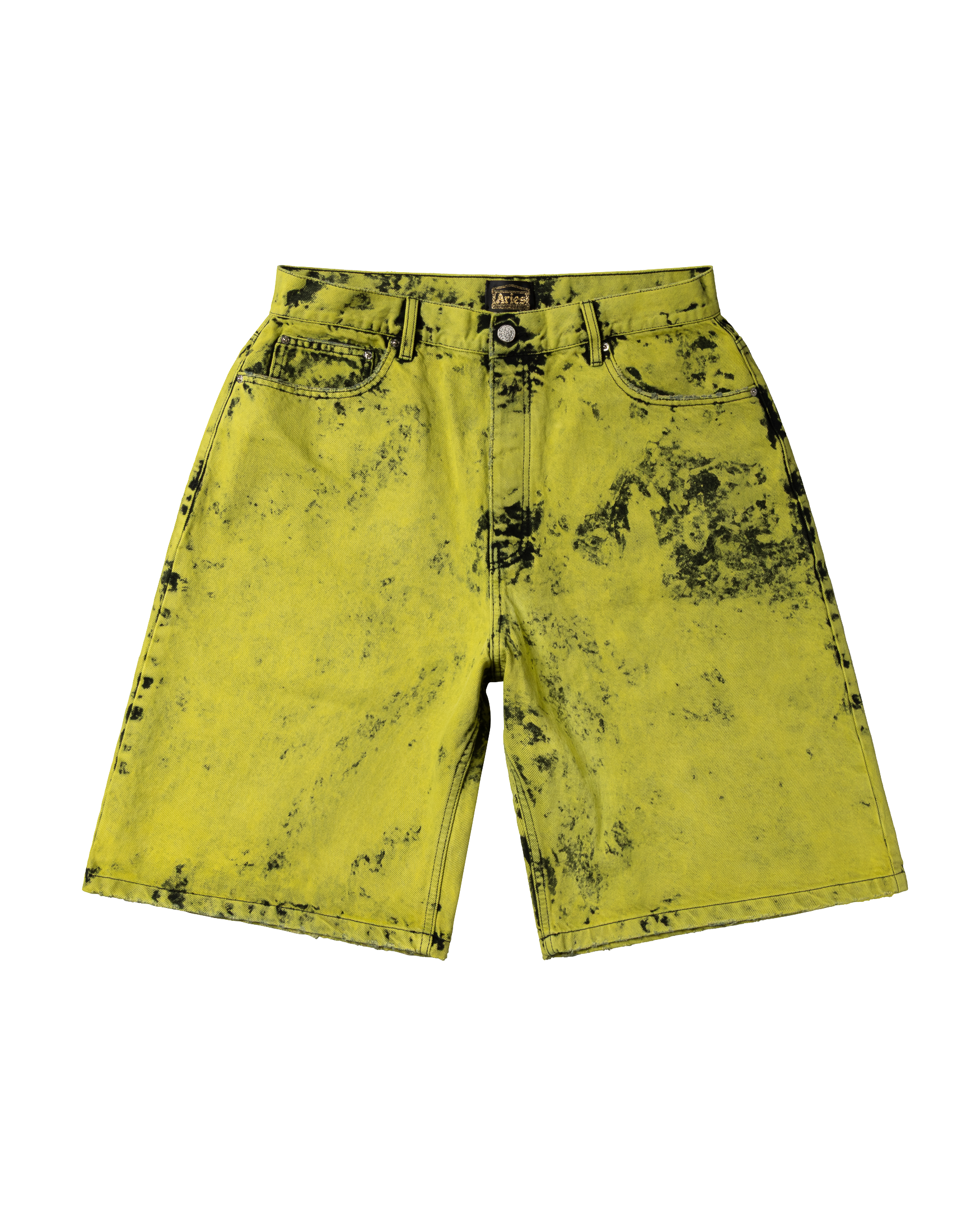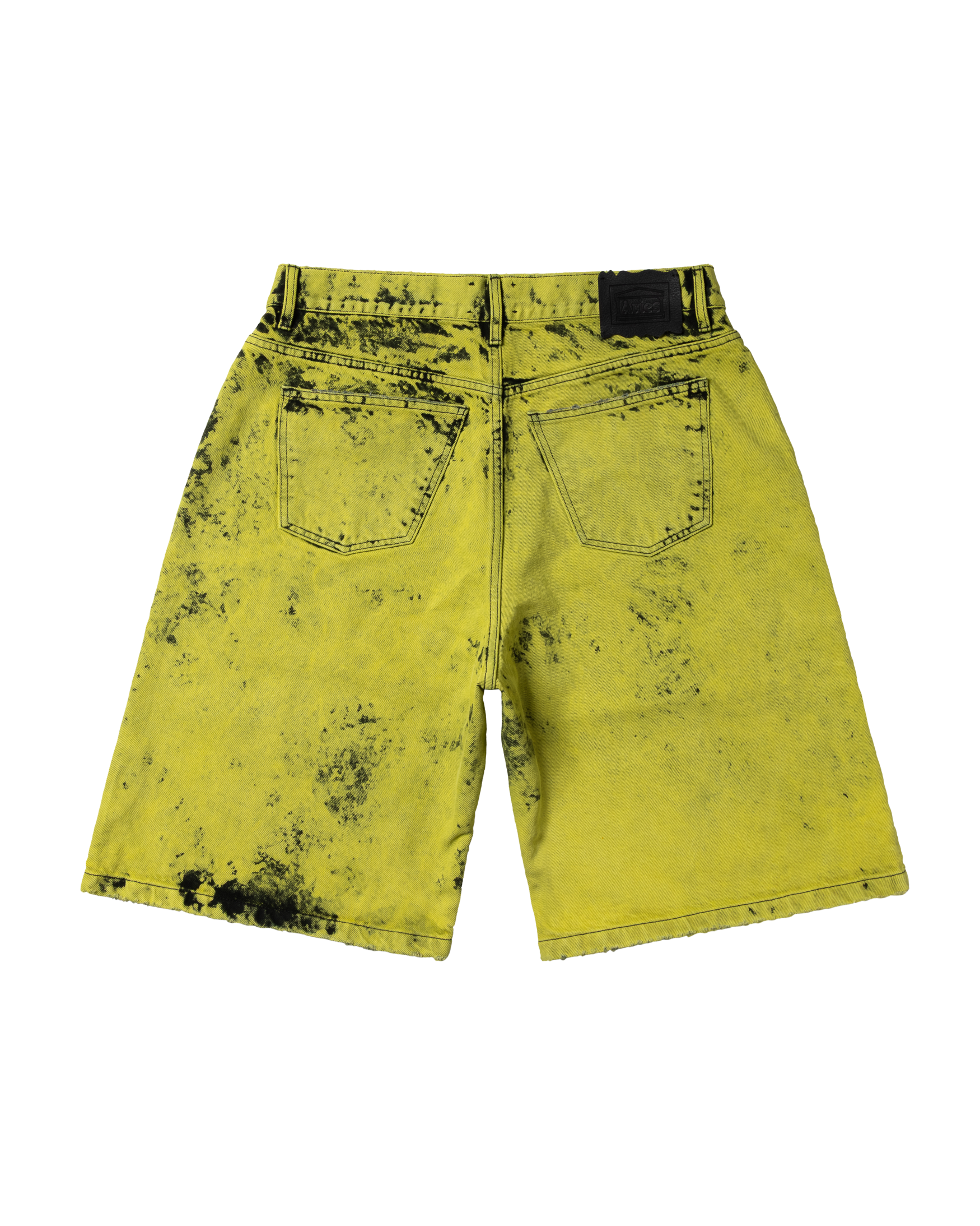 Unisex Wide Leg Short, made from 100% cotton denim. Treated with an heavy acid wash, and then over-dyed acid green.