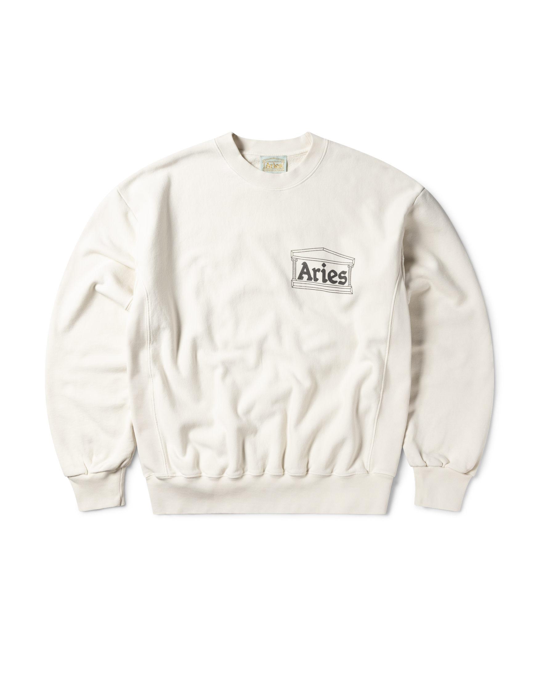 Crew neck sweatshirt, made in heavy brushed-back cotton jersey fleece, cut on the cross grain with rib panel detailing on both sides. Featuring Aries Classic Temple screen print on the chest, finished with a heavy wash treatment for an aged look. 100% cotton.