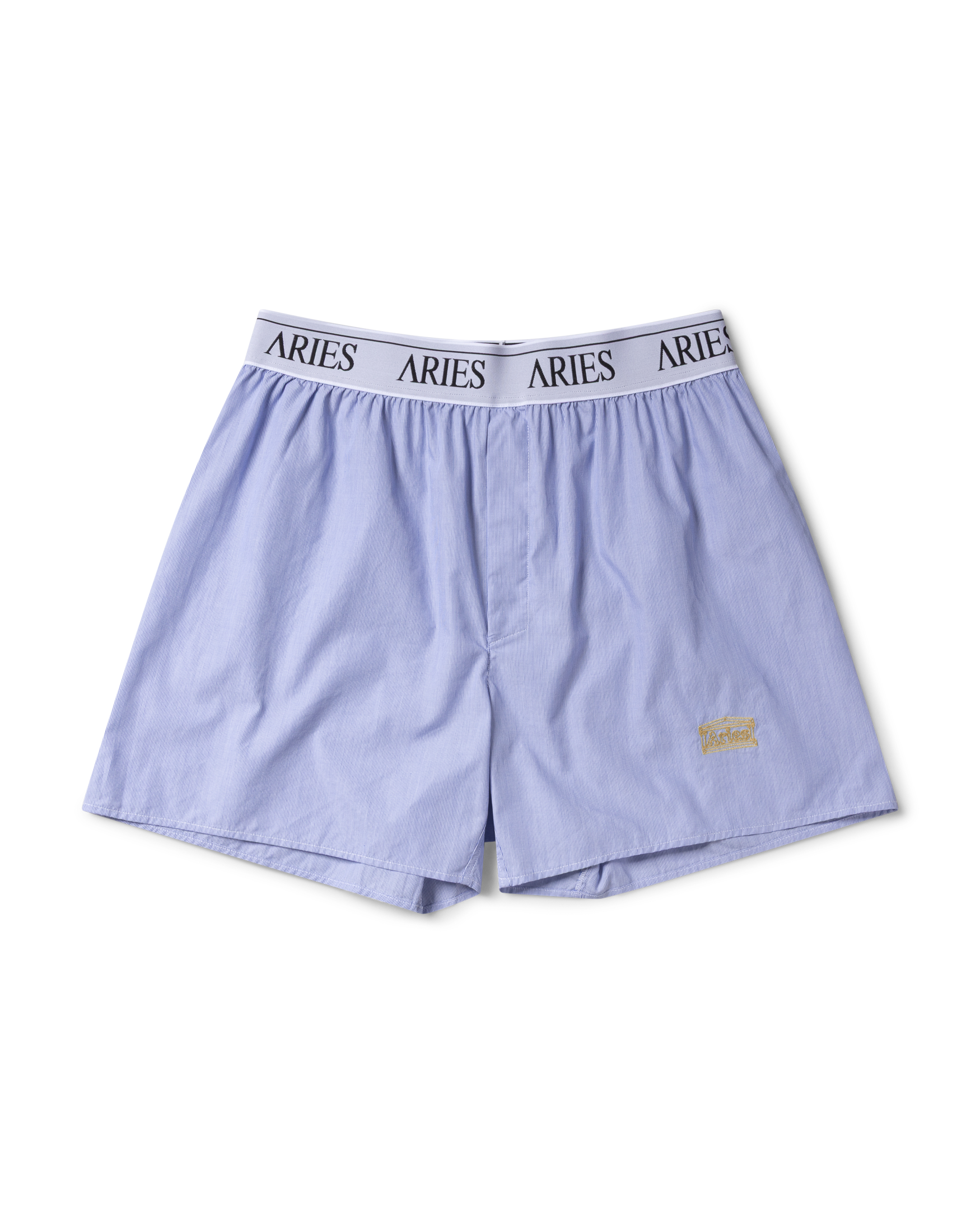 Classic Poplin Stripe boxer shorts with Aries logo elastic and gold embroidered Aries Temple on wearer's left leg. 100% cotton.